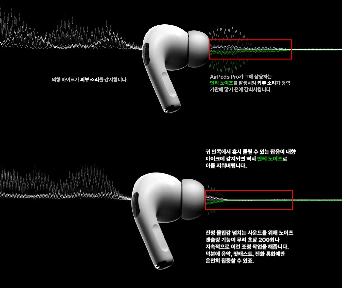 이번 에어팟 프로에서 가장 기대되는 기능입니다. 간단히 말하면 소리로 소음을 없애는 기능인데 이런 수준의 기능을 갖춘 인이어 헤드폰은 에어팟 프로가 유일하다고 합니다.