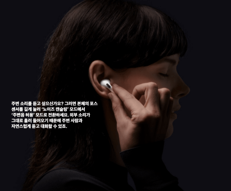 주변 소리를 듣거나 대화를 하고 싶을 때는 노이즈 캔슬링 모드를 주변음 허용 모드로 전환해서 사용할 수 있습니다.