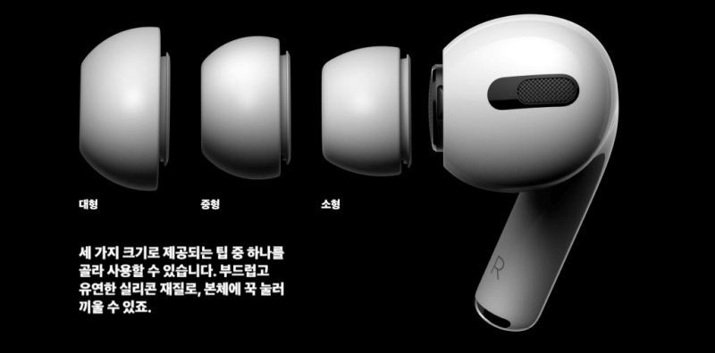 기존 에어팟에서 사용하던 오픈형이 아닌 부드럽고 유연한 실리콘 재질의 커널형으로 출시됩니다. 세 가지 크기의 팁 중 하나를 골라 사용할 수 있으며 기존 에어팟의 오픈형 타입이 마음에 안 들어 구매를 망설였다면 이번 에어팟 프로를 구매하실 기회인 것 같습니다.