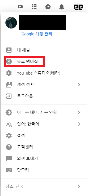 유튜브 오른쪽 위에 계정을 클릭해서 유료 멤버십으로 들어가도 됩니다.