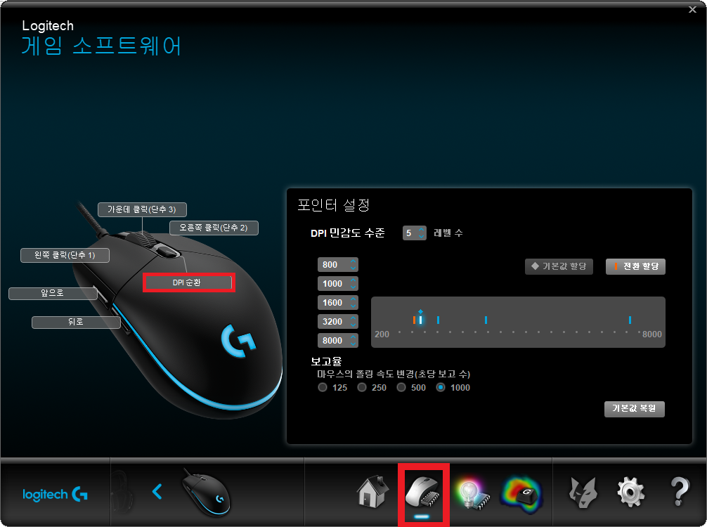 마우스 모양의 메뉴를 클릭하면 DPI 민감도를 설정할 수 있는 화면이 나옵니다 200~8000까지 민감도를 설정할 수 있고 DPI 순환 버튼으로 편하게 민감도를 바꿀 수 있습니다.