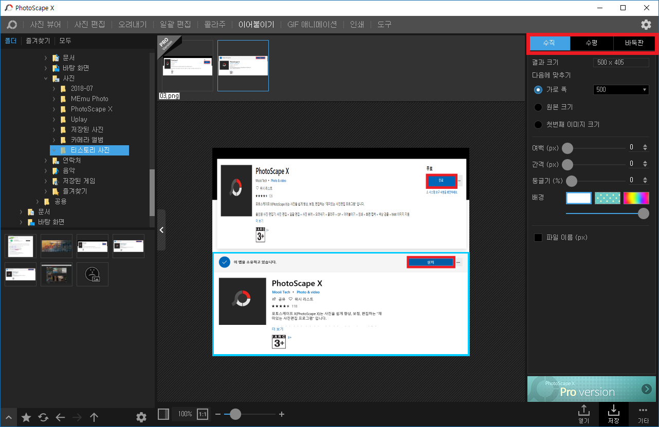 △ 이어 붙이기 메뉴를 클릭하면 이런 화면이 나옵니다. 왼쪽에서 사진이 있는 사진 폴더를 찾아줍니다. 저는 티스토리 사진이라는 폴더에 사진들을 이어 붙여 보겠습니다.