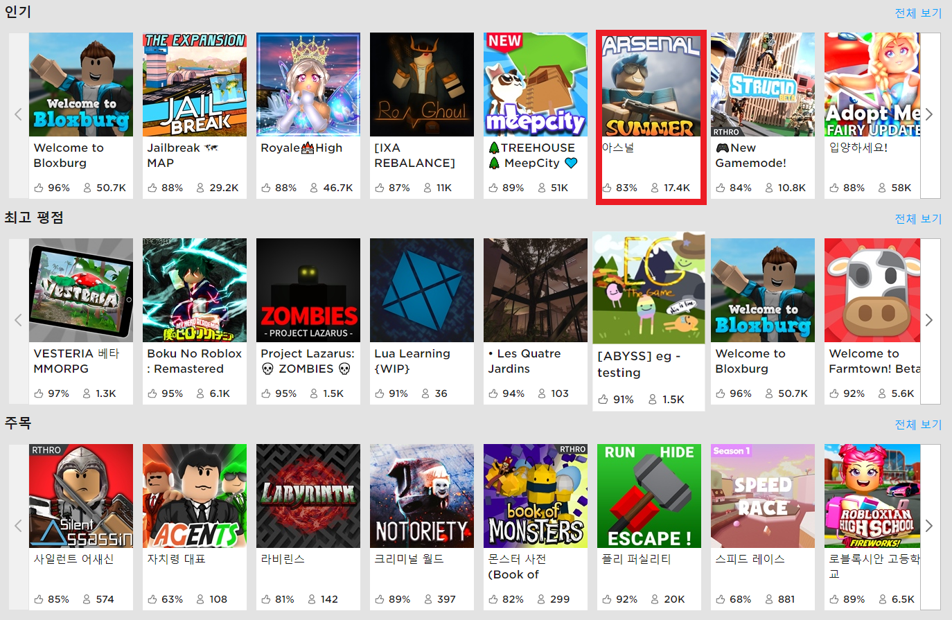 △ 로블록스 홈페이지 게임 탭으로 들어가면 인기 항목에 아스널이라는 게임이 있습니다. 지금까지는 인기 항목에 있지만 나중에 없어진다면 검색을 통해 찾으시면 됩니다.