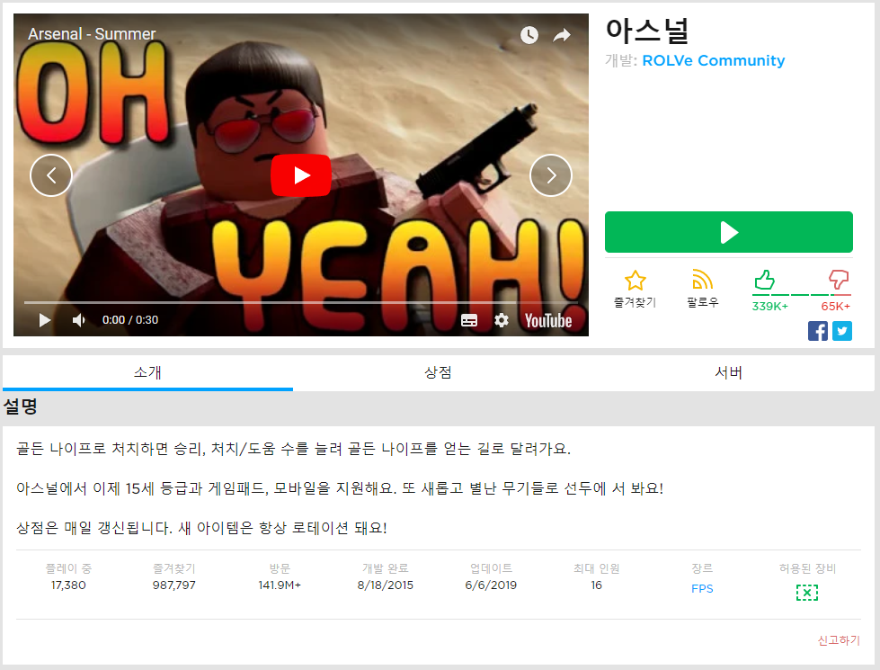 오늘은 로블록스에서 제가 해봤던 게임 중 재밌게 하고 있는 게임 중 하나인 아스널이라는 게임을 소개해드리겠습니다. 그 전에 로블록스에 대해 잘 모르시는 분들은 예전에 포스팅했던 "로블록스 게임하기 " 라는 포스팅을 보고 오시면 간단하게 알 수 있으니 보고 오시는 걸 추천드립니다.